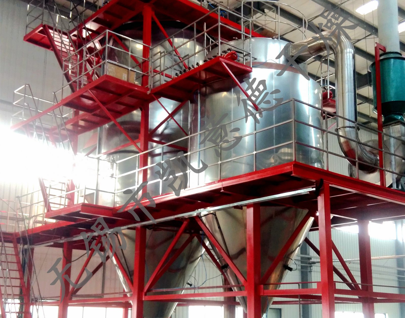 本机是将料液压入位于塔体顶部的喷嘴雾化成微小雾滴,同塔顶热风平行而下完成干燥。该机具有收尘率高,无粘壁、节能高效等特点,特别适用于热敏性物料干燥。广泛应用于食品、染料中间体等行业。